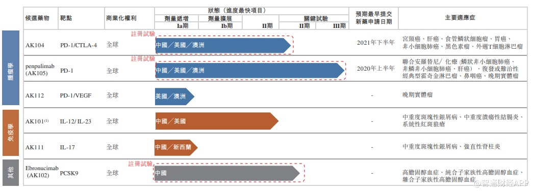 康方生物科技进度较快的两款候选药物AK104和penpulimab(AK105)均以PD-1作为靶点,前者的主要适应症包括宫颈癌、肝癌、食管鳞状细胞瘤、胃癌等,后者适应症则包括肺癌、肝癌、鼻咽癌等,分别处于关键试验的II期和III期。AK104预计最早2021年下半年提交新药申请,penpulimab(AK105)是公司与中国生物制药的主要附属公司正大天晴共同开发及商业化的PD-1抗体候选药物,预计明年年上半年在中国提交新药申请。