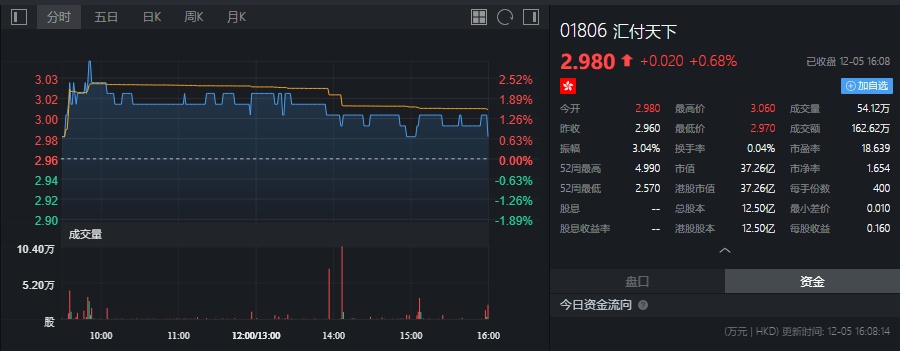 截至今日收盘,汇付天下(01806)涨0.68%,报2.98港元。