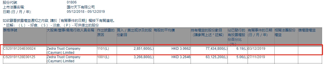 智通财经APP获悉,港交所最新资料显示,12月3日,Zedra Trust Company增持汇付天下(01806)285.16万股,每股作价3.0662港元,总金额约为874.36万港元。减持后最新持股数目为7743.48万股,最新持股比例为6.19%。