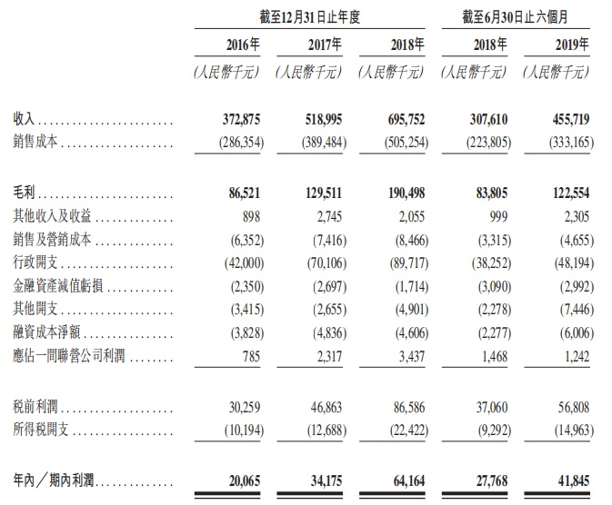 净利润从2016年的人民币2006.5万元增至2018年的人民币6416.4万元,年复合增长率为78.8%,并从截至2018年6月30日止六个月的人民币2776.8万元增加50.7%至截至2019年6月30日止六个月的人民币4184.5万元。