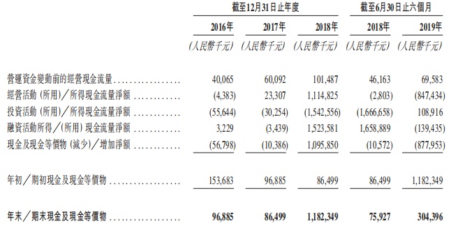公司于2016年、2017年、2018年及截至2019年6月30日止六个月,营运资金变动前的经营现金流入分别为人民币4006.5万元、人民币6009.2万元、人民币1.01亿元及人民币6958.3万元。