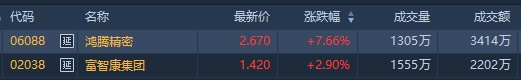 截至发稿,鸿腾精密(06088)涨8.06%,报2.68港元;富智康集团(02038)涨2.9%,报1.42港元。