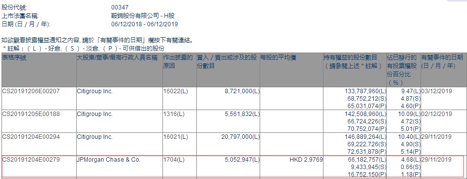 智通财经APP获悉,港交所最新资料显示,11月29日,摩根大通减持鞍钢股份(00347)505.29万股,每股作价2.9769港元,总金额约为1504.20万港元。减持后最新持股数目为6618.27万股,最新持股比例为4.68%。