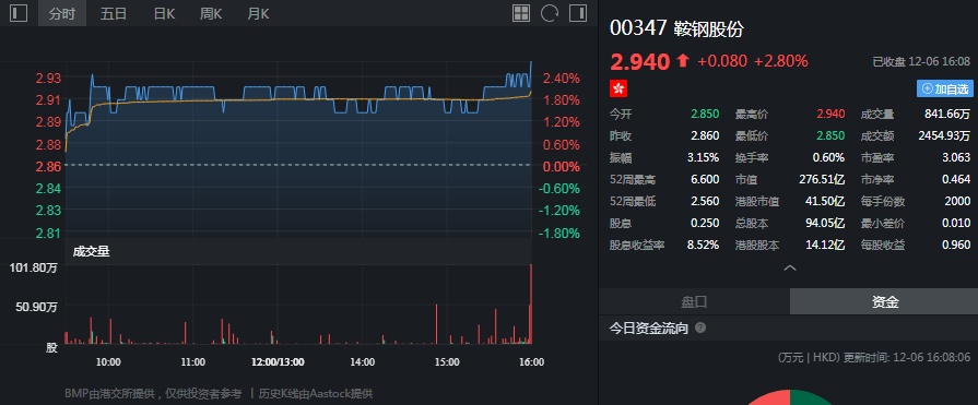 截至今日收盘,鞍钢股份(00347)涨2.8%,报2.94港元。