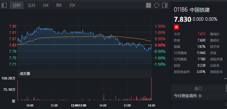 截至今日收盘,中国铁建无涨跌,报7.83港元。