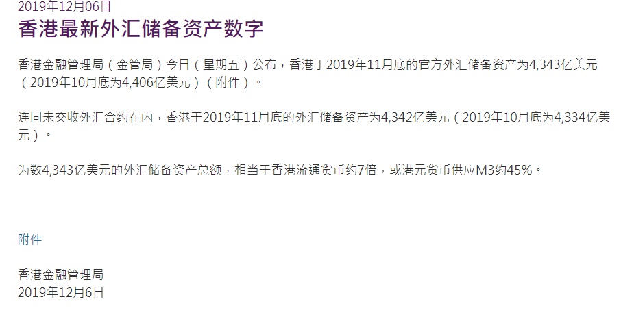 连同未交收外汇合约在内,香港于2019年11月底的外汇储备资产为4342亿美元(2019年10月底为4,334亿美元)。4343亿美元的外汇储备资产总额,相当于香港流通货币约7倍,或港元货币供应M3约45%。
