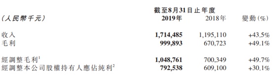 业绩方面看,截 至 2019 年8月31日,宇华教育实现收入约人民币17.14亿元(单位下同),同比增长43.5%;毛利约10亿元,同比增长49.1%;公司股权持有人应占纯利约4.85亿元,同比减少8.6%。不过经调整毛利润为10.5亿元,同比增长49.7%,经调整公司股权持有人应占纯利约7.93亿元,同比增长30.1%。
