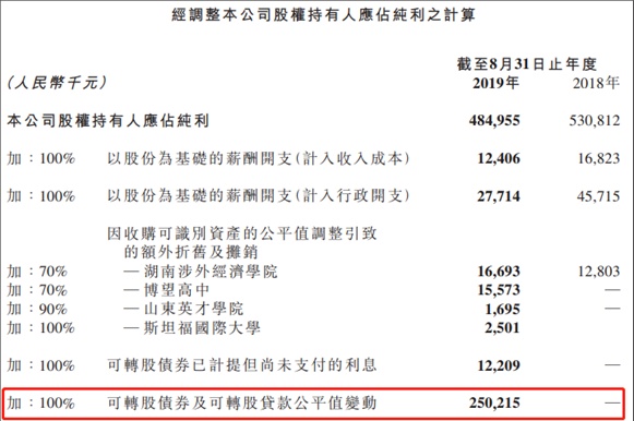 流动负债中除了短期借款有所增加外,仅公允值变动便增加了11.3亿元,而公允值变动也是宇华教育在财务报表中利润的重要调整项。从净利润调整前后相差3.08亿,而其中可转股债券和贷款的公允值变动就达到了2.5亿元。