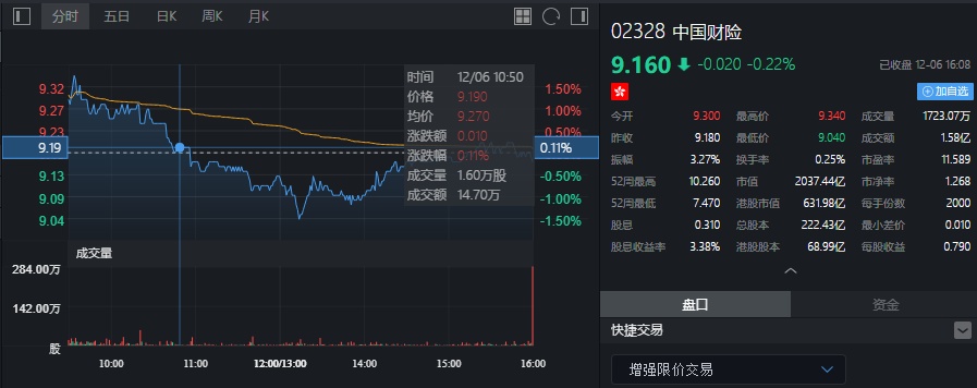 截至今日收盘,中国财险(02328)跌0.22%,报9.16港元。