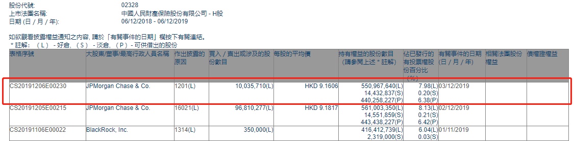 智通财经APP获悉,联交所最新资料显示,12月3日,摩根大通减持中国财险(02328)1004万股,每股作价9.1606港元,总金额约为9197.24万港元。减持后最新持股数目约为5.51亿股,最新持股比例为7.98%。