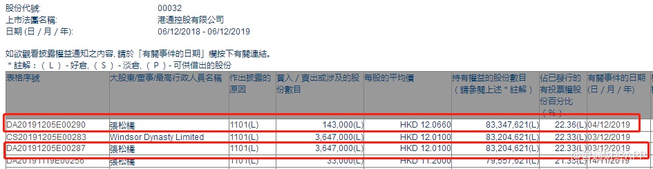 智通财经APP获悉,联交所最新资料显示,12月3-4日,张松桥分别增持港通控股(00032)364.7万、14.3万股,共379万股,每股作价分别为12.01港元及12.066港元,总金额约为4552.59万港元。增持后最新持股数目约为8334.76万股,最新持股比例为22.36%。