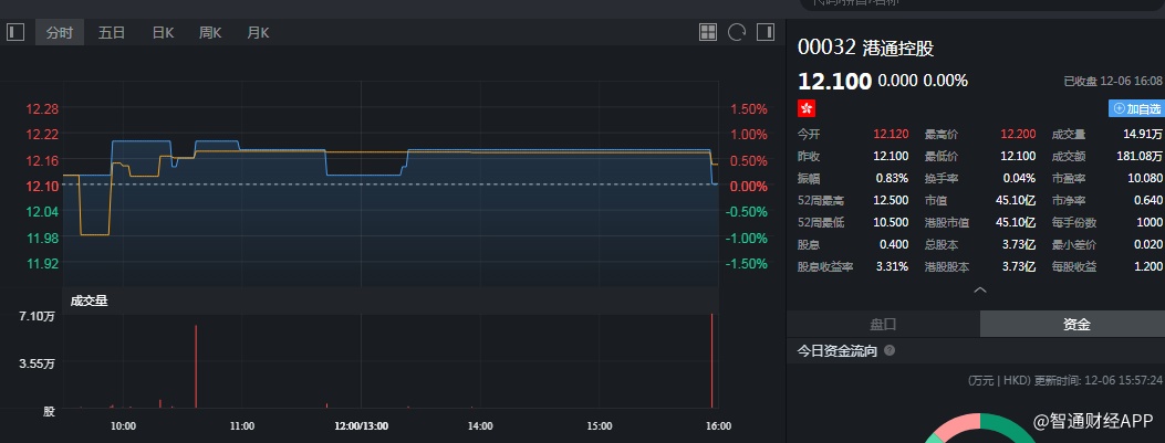 截至今日收盘,港通控股(00032)无涨跌,报12.10港元。