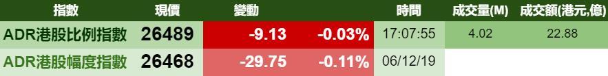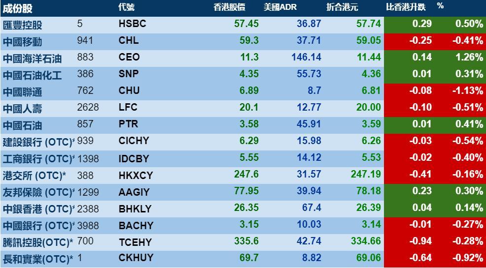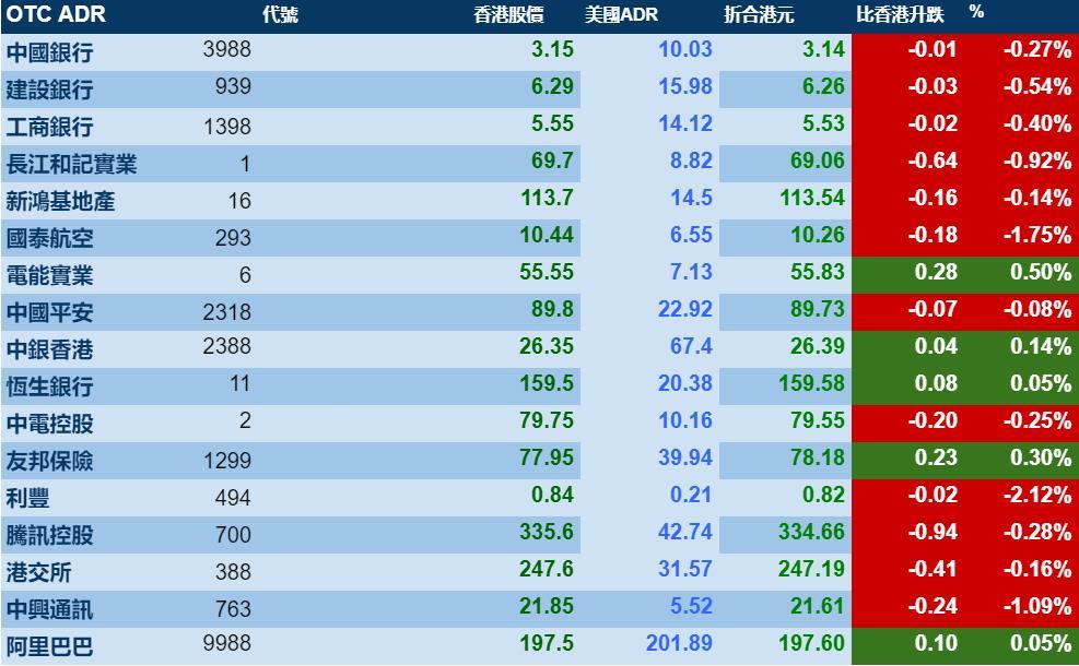 智通财经APP获悉,周五(12月6日)美国三大股指受利好消息提振,高开高走。港股ADR指数却小幅下跌,按比例计算,收报26489点,跌9.13点或0.03%。汇丰控股收报57.74元,较港收市升0.29元;腾讯控股收报334.66元,较港收市跌0.94元。