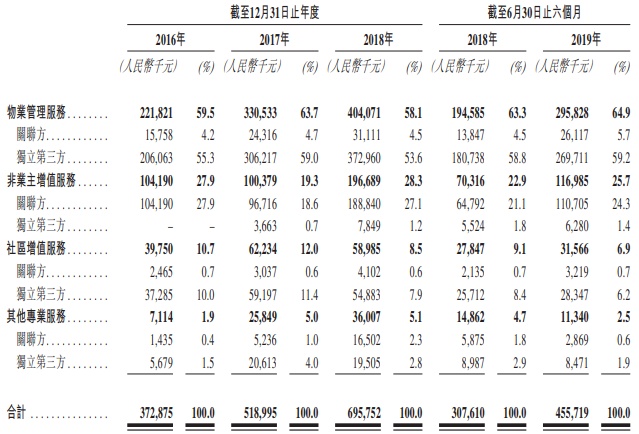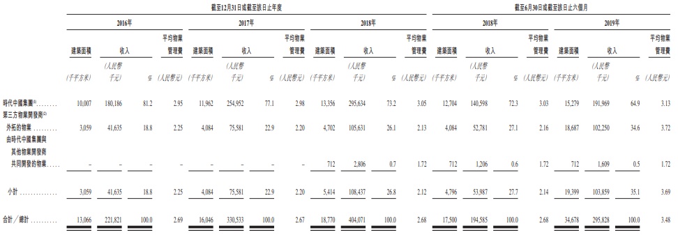 从上图可以发现,时代邻里的总收入从2016年的3.73亿元增长至2018年的6.96亿元,年复合增速为36.6%。2019年上半年增速更高,同比增长48.1%至4.56亿元。主要是在2019年3月收购广州东康,使得在管物业面积增加了1340万平方米。