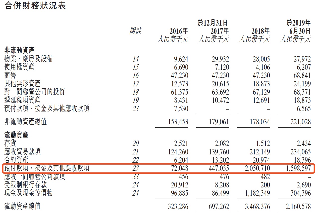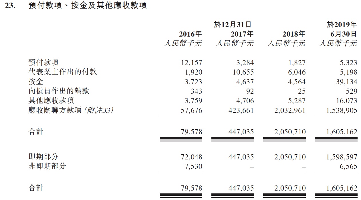 从附注中可以看到,导致该科目快速增长的主要是“应收关联方款项”。招股书披露,公司做了资产抵押证券安排后向时代中国集团提供贷款,截至2018年底和2019年上半年,贷款余额分别为16亿元和15.26亿元,利率介乎6.5%至7.5%。