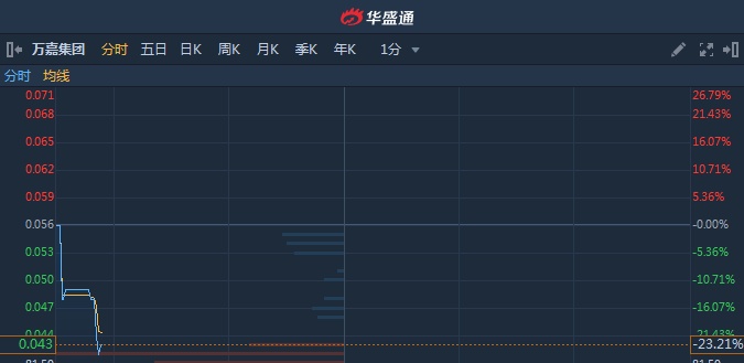 智通财经APP获悉,细价股万嘉集团(00401)早盘股价遭重挫,无量下跌逾20%,暂居跌幅榜首位。截至9时52分,跌23.21%,报价0.043港元,成交额7.541万。