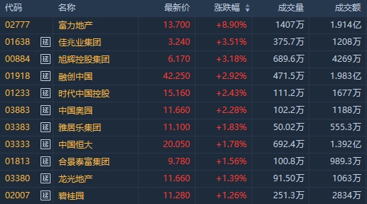 截至发稿,富力地产(02777)涨8.74%,报13.68港元;佳兆业集团(01638)涨4.47%,报3.27港元;新城发展(01030)涨3.45%,报9港元;旭辉控股集团(00884)涨3.34%,报6.18港元;融创中国(01918)涨3.05%,报42.3港元。