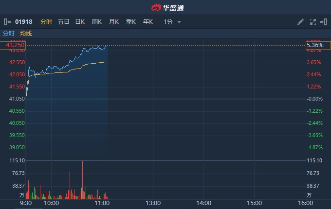 智通财经APP获悉,广发证券于本月6日发布研报,融创中国(01918)11月销售规模创历史新高。11月公司实现合同销售金额666.5亿元,同比增长48%,创下公司历史上单月销售规模新高。该行维持“买入”评级。融创中国今日盘中高见43.25港元,距前高44.80港元仅一步之遥。截至发稿,涨5.36%,报43.25港元,成交额6.43亿港元。
