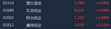 智通财经APP获悉,纸业股全线走强,暂领涨大市,理文纸业(02314)涨超5%,一度高见5.81港元,创半年新高。截至13时50分,理文纸业(02314)涨5.09%,报价5.78港元,玖龙纸业(02689)涨3.44%,阳光纸业(02002)涨1.68%。