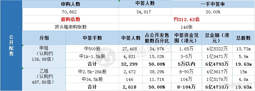 其中,公开配售申购人数70862,一手中签率30%,超购倍数约312.42倍。