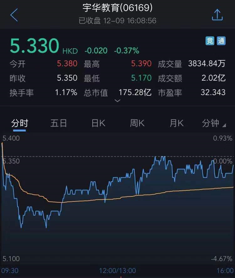 截至今日收盘,宇华教育跌0.37%,报5.33港元。