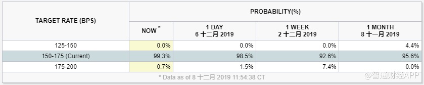 根据芝加哥商品交易所“美联储观察”公布的最新统计数据,美联储维持利率不变的概率由一周前的92.6%升至目前(截至12月8日)的99.3%,而预计加息的概率仅为0.7%。