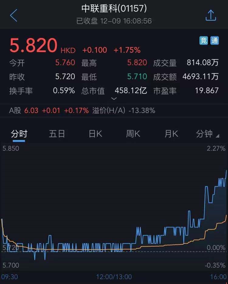 截至今日收盘,中联重科涨1.75%,报5.82港元。
