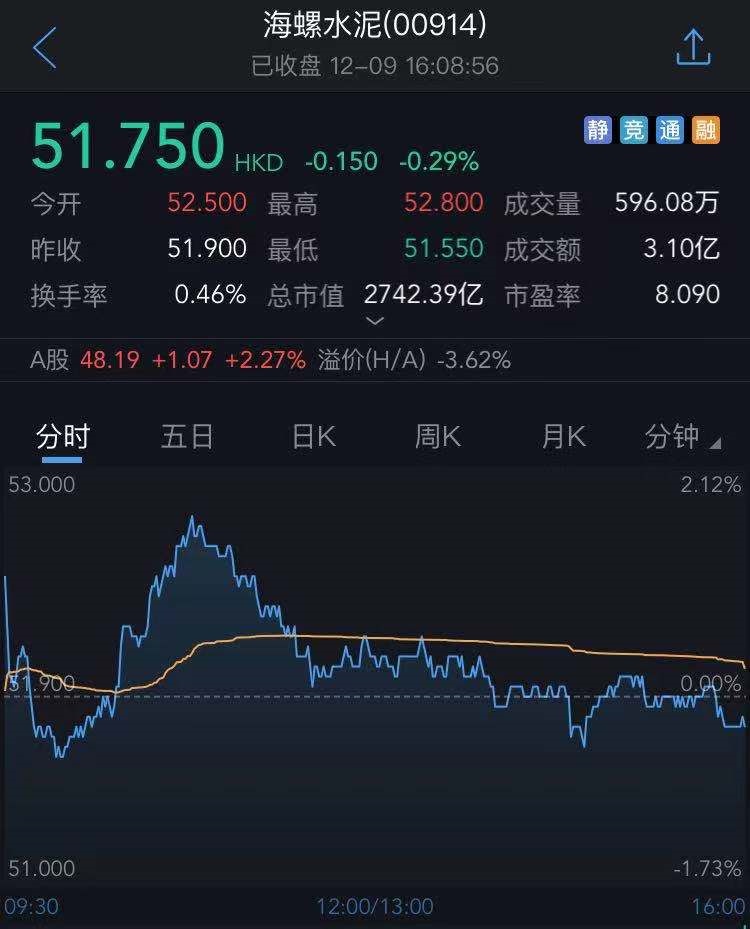 截至今日收盘,海螺水泥跌0.29%,报51.75港元。