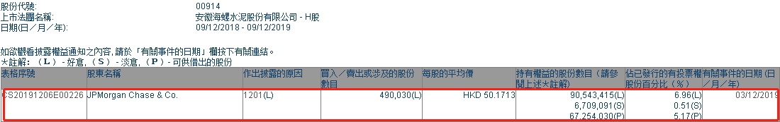 智通财经APP获悉,联交所最新资料显示,12月3日,摩根大通减持海螺水泥(00914)49.003万股,每股作价50.1713港元,总金额约为2458.54万港元。减持后最新持股数目约为9054.34万股,最新持股比例为6.96%。