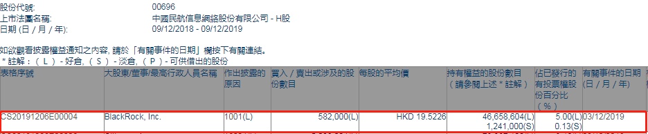 智通财经APP获悉,联交所最新资料显示,12月3日,贝莱德增持中国民航网络(00696)58.20万股,每股作价19.5226港元,总金额约为1136.22万港元。增持后最新持股数目约为4665.86万股,最新持股比例为5.00%。