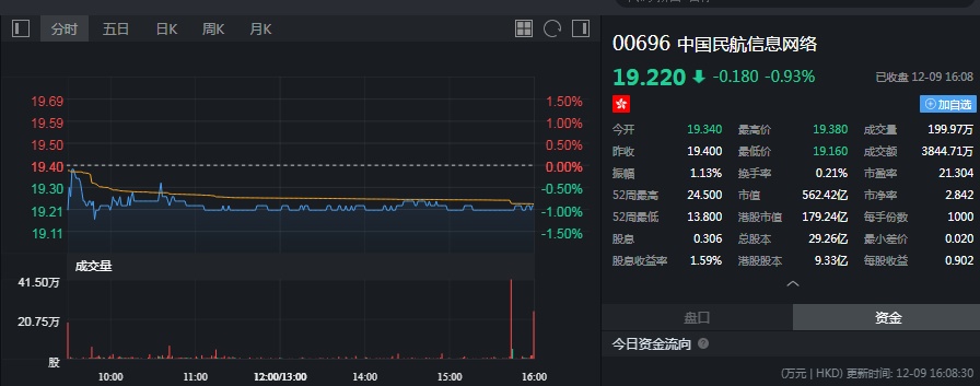 截至今日收盘,中国民航网络(00696)跌0.93%,报19.22港元。