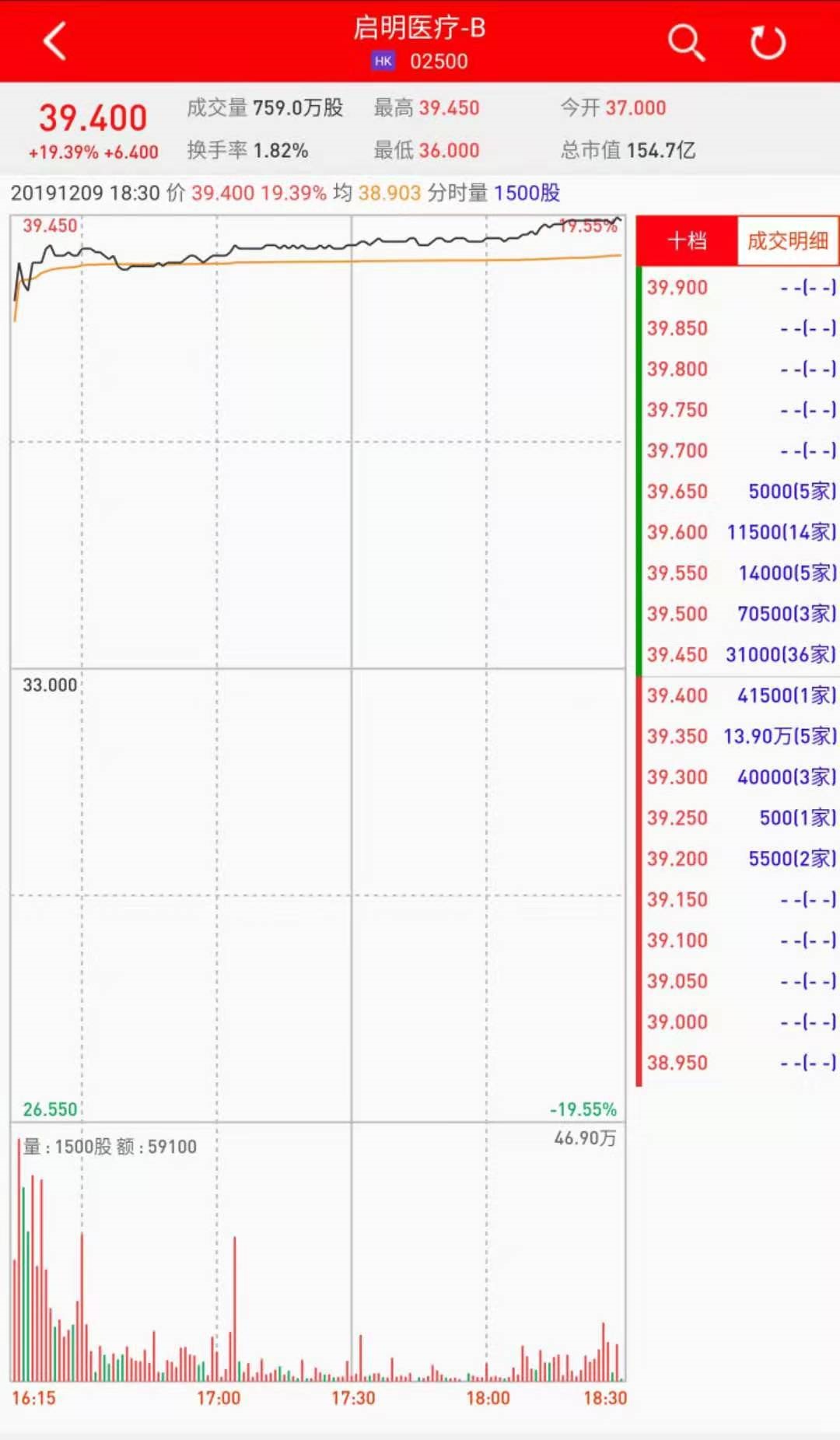 智通财经APP获悉,启明医疗-B(02500)将于12月10日挂牌,该股暗盘盘初拉升,截至收盘,利弗莫尔证券暗盘交易显示其报价39.4港元,较招股价33港元涨19.39%。每手500股,不计手续费,每手赚3200港元。