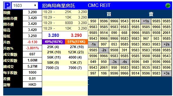 智通财经APP获悉,招商局商业房托(01503)将于12月10日挂牌,该股暗盘盘初下跌,截至收盘,辉立证券暗盘交易显示其报价3.29港元,较招股价3.42港元跌3.801%。每手1000股,不计手续费,每手亏130港元。