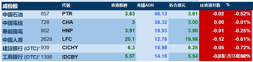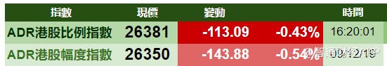 智通财经APP获悉,美股周一(12月9日)走势偏软,三大指数齐跌。港股ADR指数也跟随下跌,按比例计算,收报26381点,跌113.09点或0.43%。汇丰控股收报57.66元,较港收市跌0.04元;腾讯控股收报333.08元,较港收市跌3.12元。