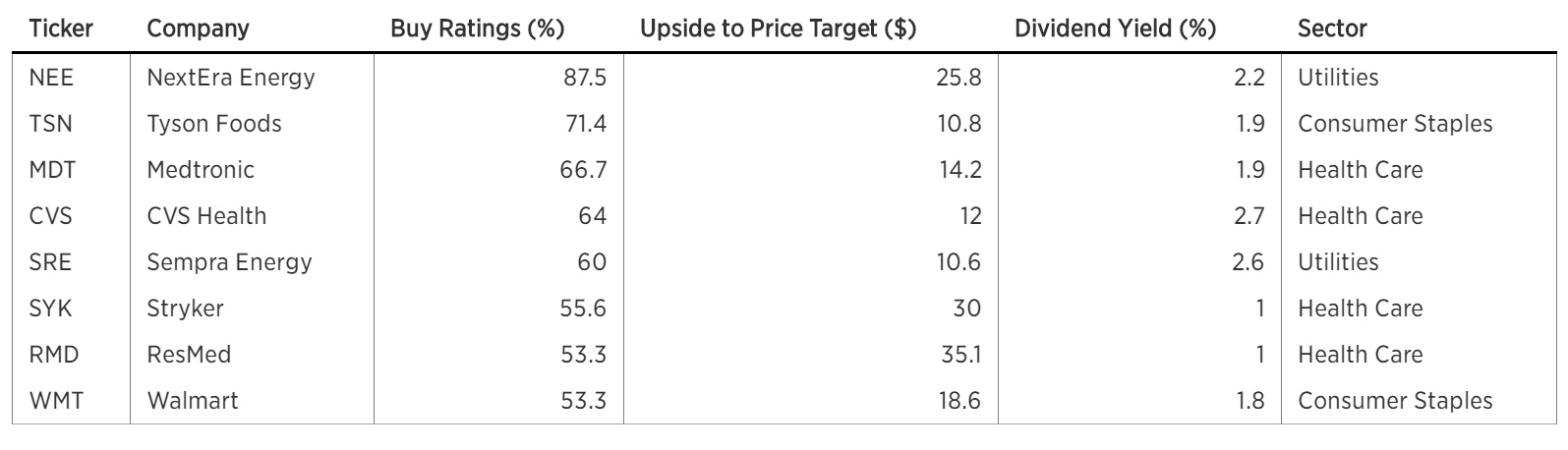 NextEra Energy(NEE.US)是最大的风能和太阳能生产商,也是该列表中最受欢迎的防御性股票,近90%的分析师建议买入该股。摩根大通在给客户的报告中指出,NextEra的股东总回报包括8%至9%的收益增长和2.2%的股息收益率。