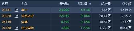 智通财经APP获悉,体育用品股集体高位回撤,李宁(02331)盘中一度跌超8%。截至发稿,李宁跌4.72%,报24.2港元;安踏体育(02020)跌2.57%,报72.05港元;滔搏(06110)跌2.12%,报8.79港元;特步国际(01368)跌1.78%,报3.86港元。