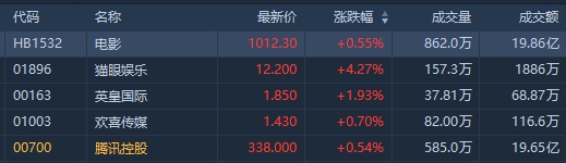 智通财经APP获悉,2019年内地电影票房突破600亿创新高,春节档临近,市场资金关注影视股。A股传媒娱乐集体上扬,港股影视股跟涨。