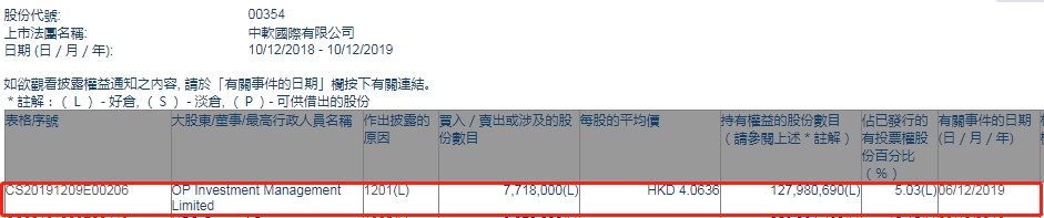 智通财经APP获悉,联交所最新资料显示,12月6日,OP Investment Management减持中软国际(00354)771.8万股,每股作价4.0636港元,总金额约为3136.29万港元。减持后最新持股数目约为1.28亿股,最新持股比例为5.03%。