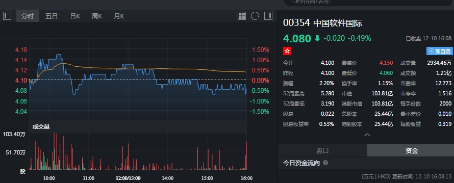 截至今日收盘,中软国际(00354)跌0.49%,报4.08港元。