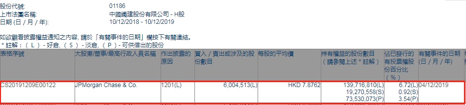 智通财经APP获悉,联交所最新资料显示,12月4日,摩根大通减持中国铁建(01186)600.4513万股,每股作价7.8762港元,总金额约为4729.27港元。减持后最新持股数目约为1.40亿股,最新持股比例为6.72%。
