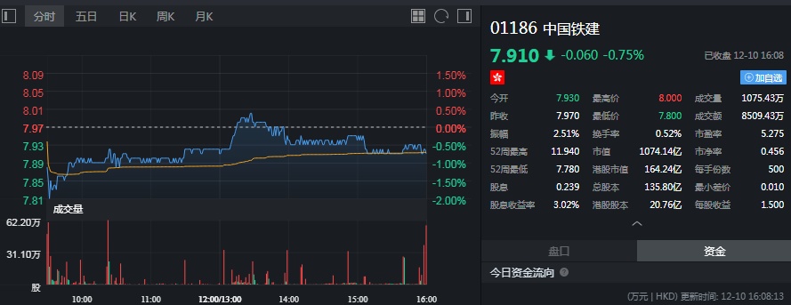 截至今日收盘,中国铁建(01186)跌0.75%,报7.91港元。