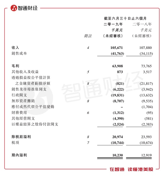 公司2018年业绩还是比较亮眼的,其中收入同比增长36.6%至2.28亿美元,毛利同比增长27.7%至1.41亿美元,毛利率虽然下滑4.3个百分点,但仍保持62.1%的高位,公司股东应占净利润达到了2041.3万美元,同比大幅增长131.8%。然而到了2019年上半年,公司营收仅录得1.06亿美元,同比下滑2%,毛利更是同比下滑13.4%至6390.8万美元,毛利率再度下降7.9个百分点至60.5%。