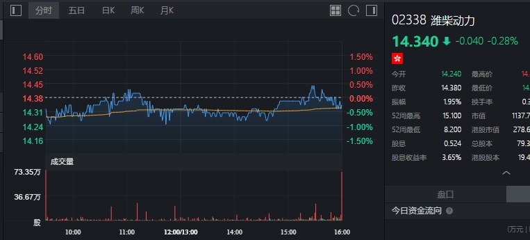 截至今日收盘,潍柴动力跌0.28%,报14.34港元。