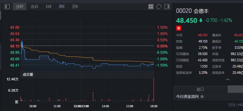 截至今日收盘,会德丰跌1.42%,报48.45港元。