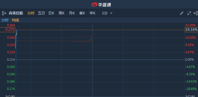 智通财经APP获悉,森美控股(00756)发盈喜,中期溢利不少于3亿元人民币,消息刺激股价早盘涨势延续。截至9时32分,涨19.16%,报价0.255港元,成交额176.1万。