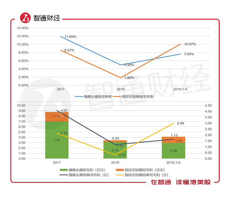 按照往年,该公司的摄像头模组的毛率要比指纹识别模组高,但今年两类产品均有较大幅度提升,其中指纹识别模组毛率提升主要为单价提升较为明显,而摄像头模组主要为高端产品结构比较明显,从而提升毛率。上半年,指纹识别模组单件毛利2.99元,比摄像头模组高出1.35元。
