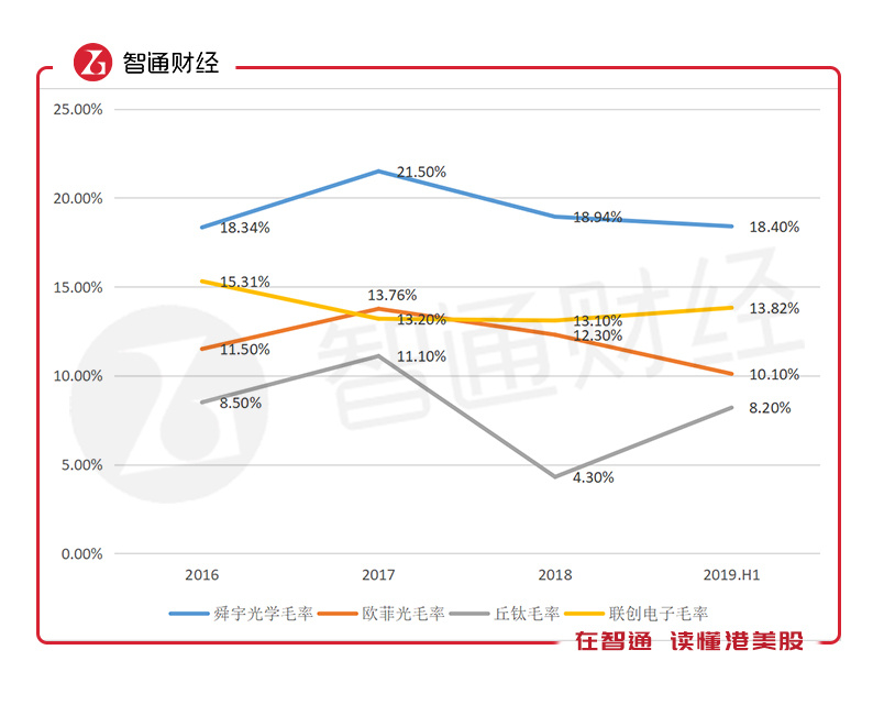 智通财经APP了解到,丘钛的毛率比行业要低,且变动大。比如在同行中,欧菲光毛率虽有下滑,但保持稳定在11%左右,舜宇光学(02382)稳定在18%左右,联创电子稳定在13%左右,而丘钛毛率走势如过山车。