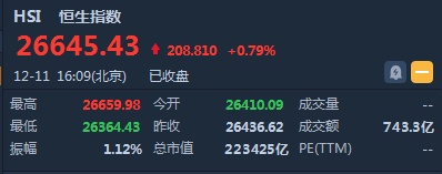 智通财经APP获悉,恒指早盘低开0.1%,报26410.09点。截至收盘,恒生指数涨208.81点或0.79%,报26645.43点,全日成交额达743.38亿。国企指数涨1.03%,报10502.53点,红筹指数涨0.79%,报4287.63点。
