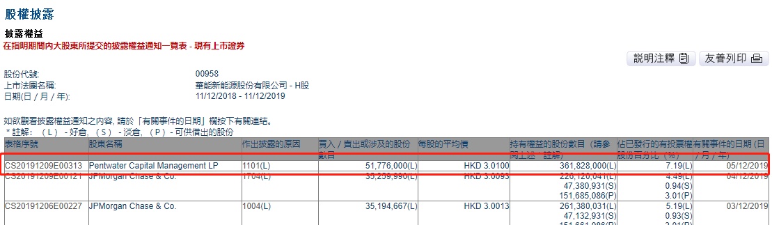 智通财经APP获悉,联交所最新资料显示,12月5日,Pentwater Capital Management LP增持华能新能源(00958)5177.6万股,每股作价3.01港元,涉及总金额约为1.56亿港元。增持后最新持股数目约为3.618亿股,最新持股比例为7.19%。