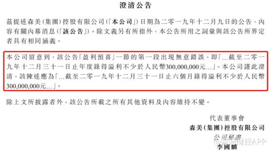 更加精彩的剧情还在后面,智通财经APP观察到,港股收盘后,森美控股却在晚间“偷偷”发布了一条澄清公告,将之前的预期年度溢利不少于3亿元人民币修改为“截至2019年12月31日六个月录得溢利不少于人民币3亿元”,将年度溢利预增修改为中期溢利预增。